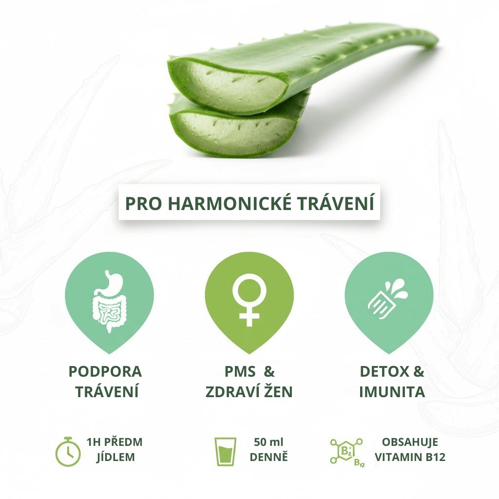 Látky obsažené v listech aloe vera napomáhají normální funkci gastrointestinálního traktu a přirozené obranyschopnosti - imunitní systém. Rovněž detoxikuje organismus od škodlivých látek.