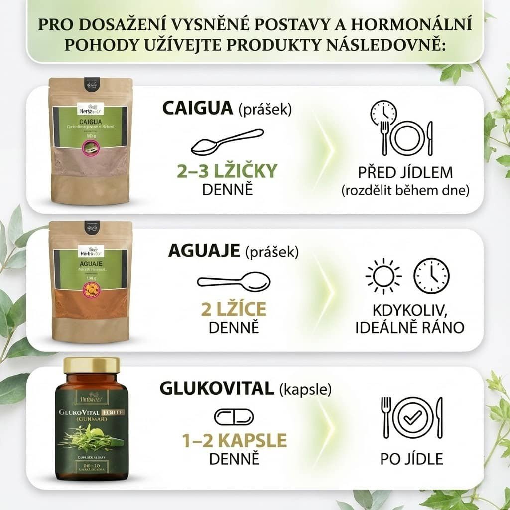 - Caigua (prášek): 2–3 lžičky denně před jídlem (rozdělit během dne).