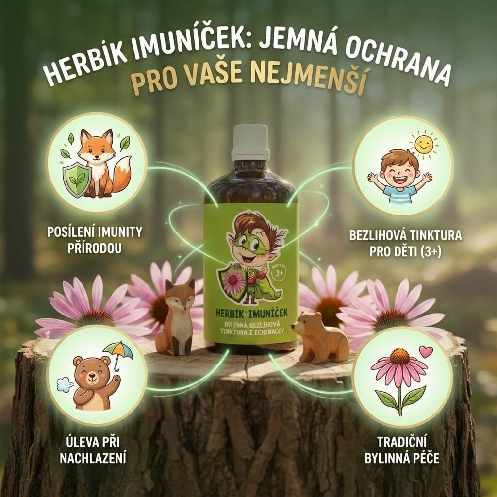 Výsledkem je tinktura, která má přirozeně nasládlou chuť (i bez přidaného cukru!) a kterou děti polykají bez odmlouvání. Hlavní ingrediencí je silný extrakt z Echinacey, která funguje jako přírodní štít do sychravých dnů.