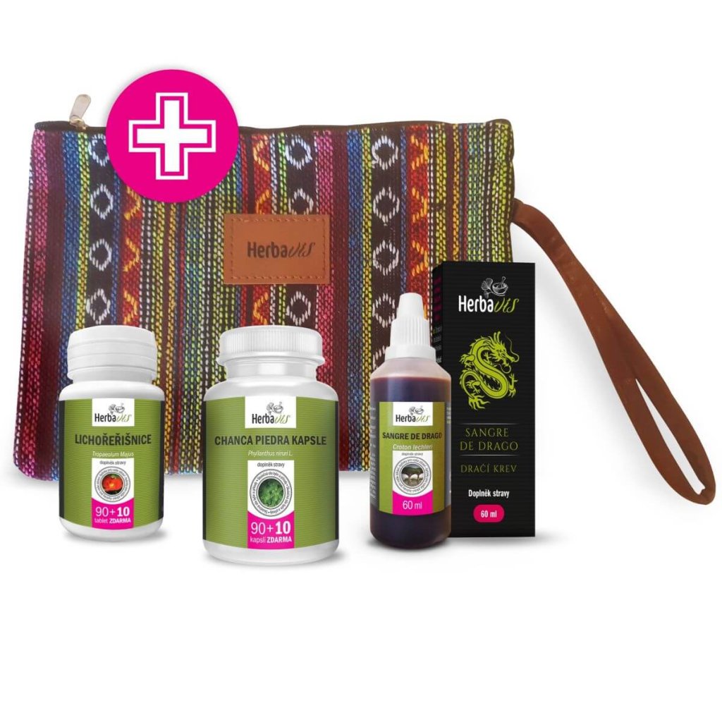 1x Sangre de Drago (50 ml), 1x Lichořeřišnice (100 tbl), 1x Chanca Piedra (100 cps), 1x Plátěná taštička s peruánským vzorem.