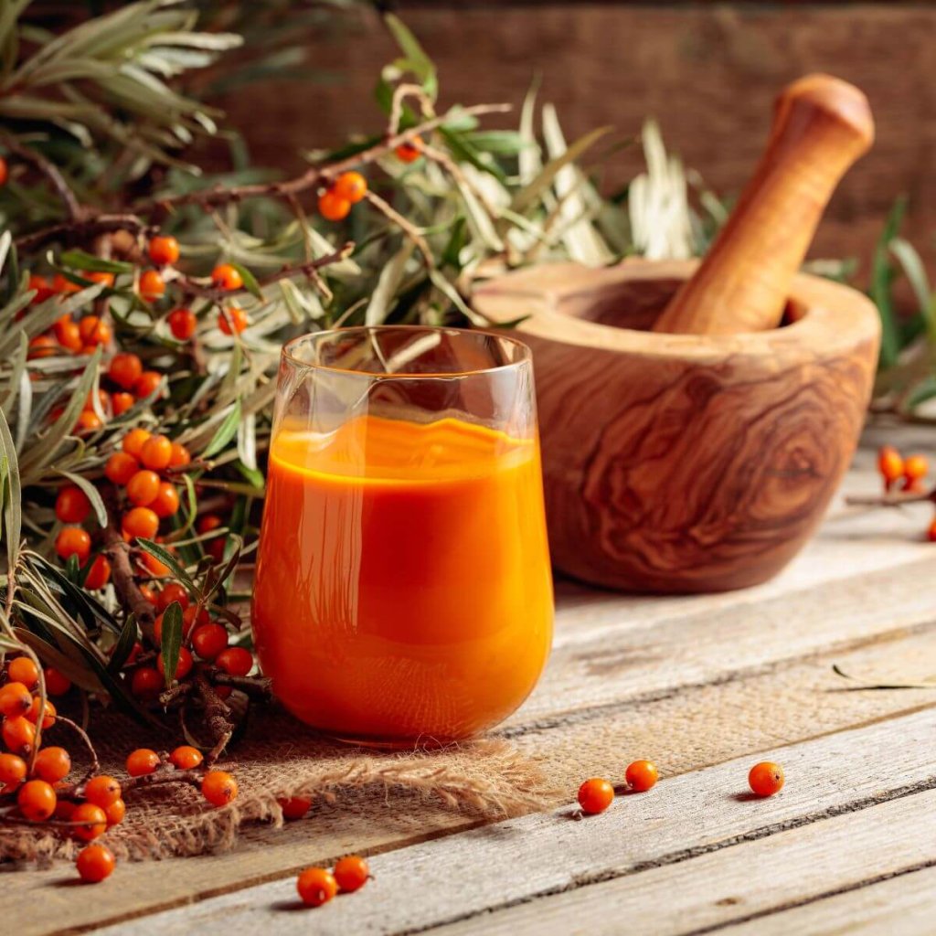 100% šťáva z Rakytníku řešetlákového (Hippophae rhamnoides L.).