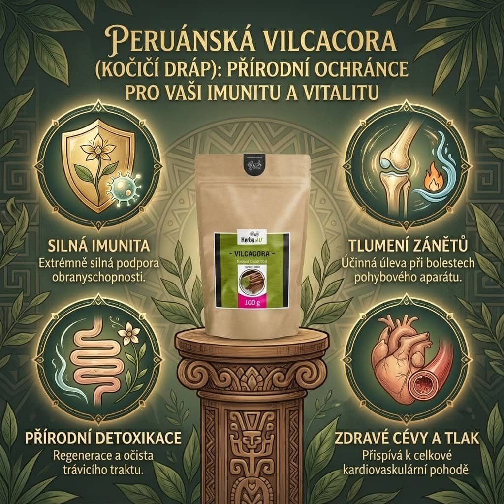 100% peruánská Vilcacora (Uncaria tomentosa) – sušená vnitřní kůra popínavé rostliny.